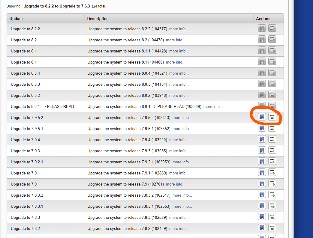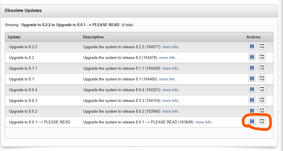 Lorsque vous avez terminé la mise à jour vers 7.9.5.2, vous pourrez procéder à la passation vers la version 8. Dans la section des mises à jour ( SERVER / UPDATES ) , rendez-vous dans la section du bas (Obselete Updates) afin de voir la mise à jour 8.0.1 --> PLEASE READ . Vous pourrez télécharger celle-ci en appuyant sur la disquette.