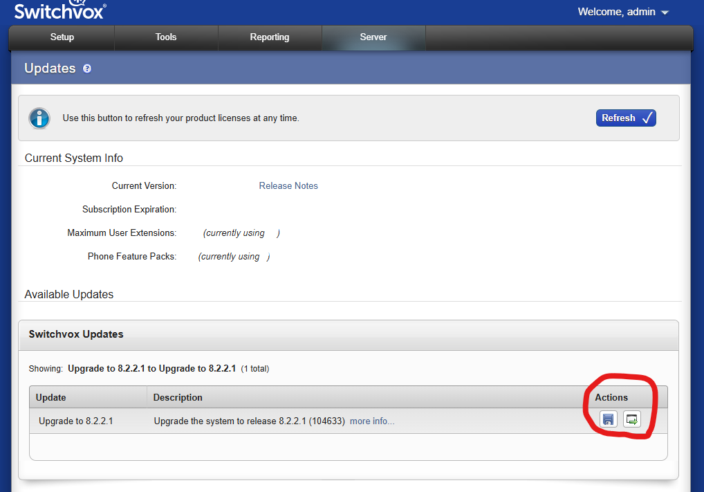 Après avoir complété l'étape 3, retournez dans la section des mises à jour ( SERVER / UPDATES ), et observez la section "Switchvox Updates". Une seule mise à jour sera dans cette section. Dans la photo ci-dessous, vous verrez la version 8.2.2.1 Téléchargez et appliquez cette mise à jour. Cette mise à jour prendra de nouveau environ 20 minutes. Laissez le système travailler. Vos téléphones Digium/Sangoma se mettrons à jour une fois le redémarrage du PBX complété.