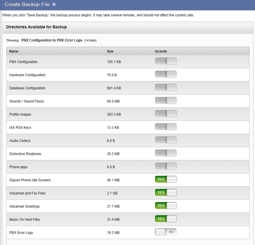 Cochez toutes les sections à l'exception de PBX ERROR LOG, puis appuyez sur SAVE BACKUP. Le processus prendra quelques minutes.
